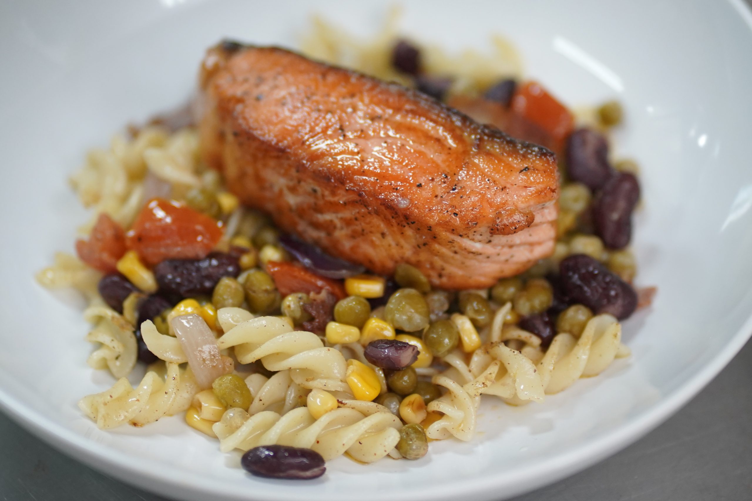 Honey brown butter glazed salmon with roasted succotash, a common between tomatoes and fusilli