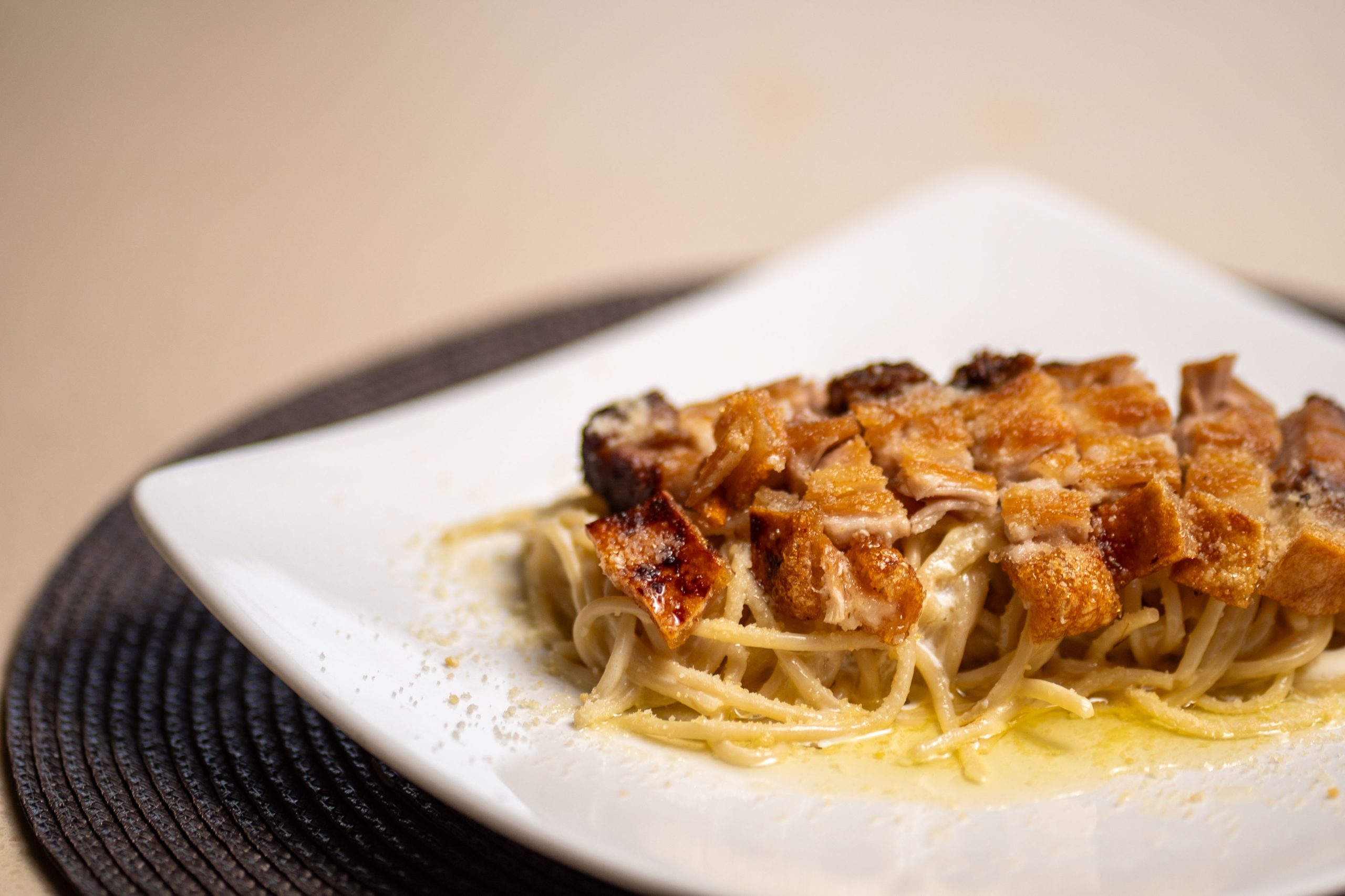 Dried taro leaves braised in coconut milk and topped with 'lechon kawali'
