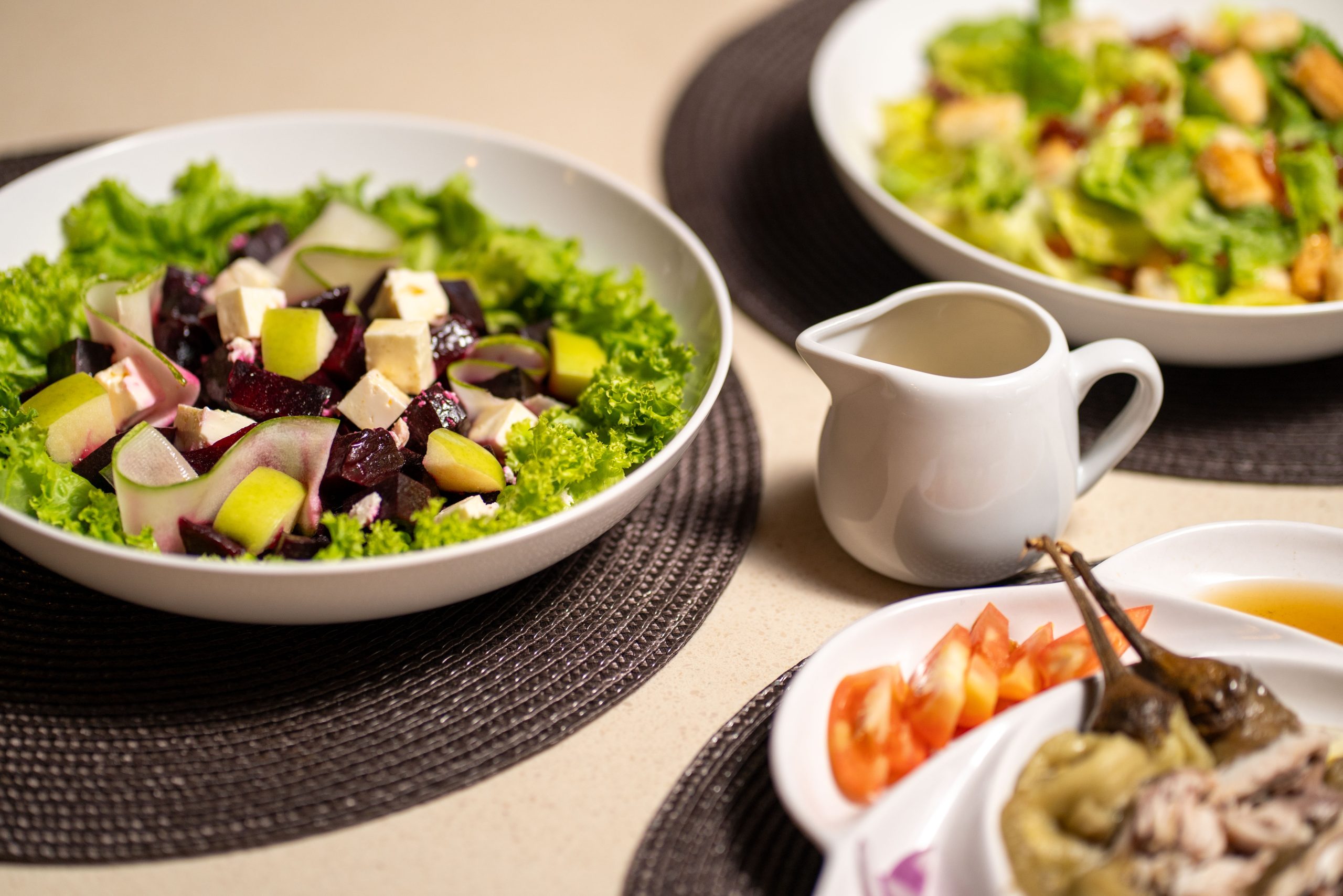 Mixed lettuce, roasted red beets, cucumbers, green apples, and feta cheese with citrus green vinaigrette