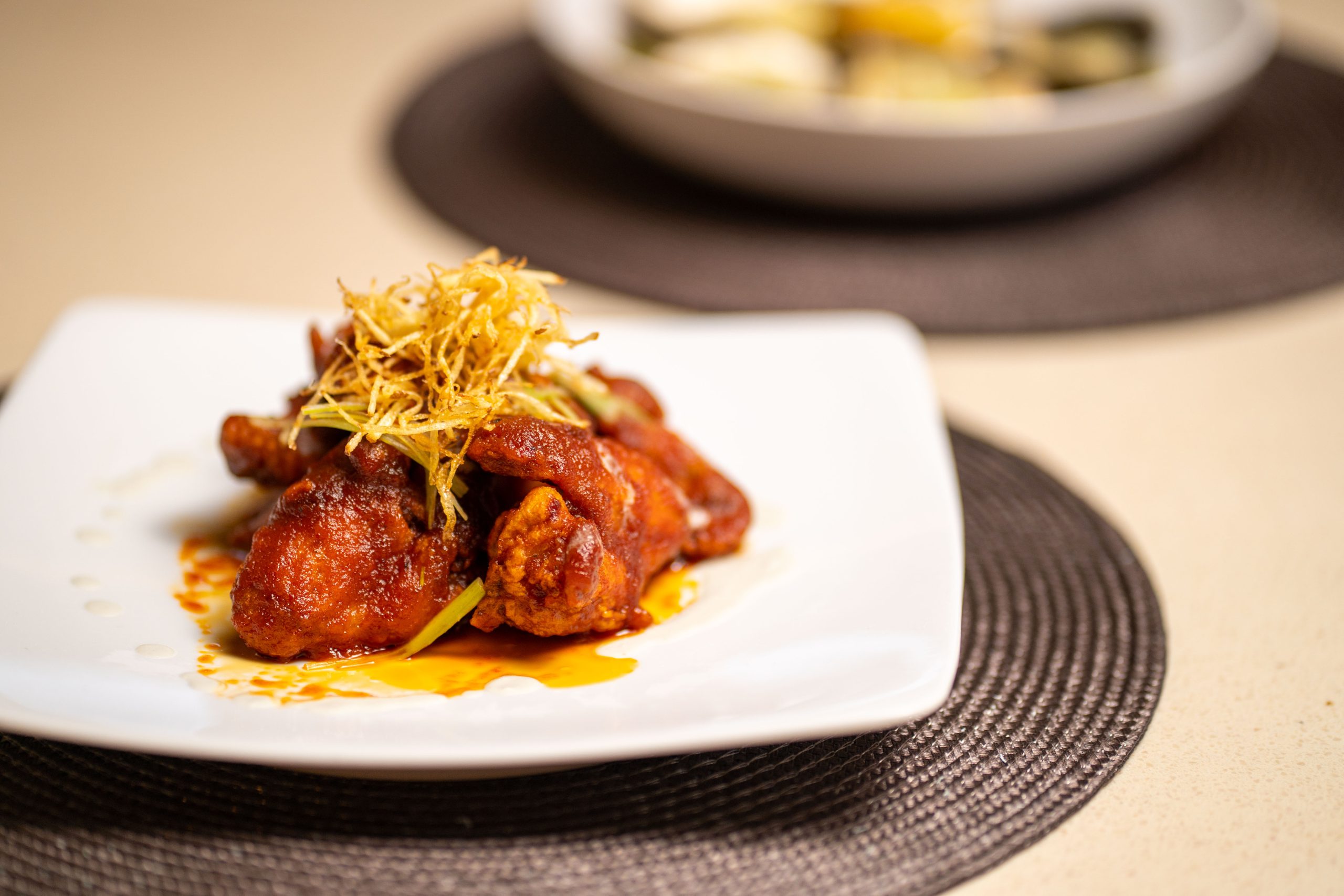 Homemade barbecue pork belly paired with stuffed squid cooked to perfection
